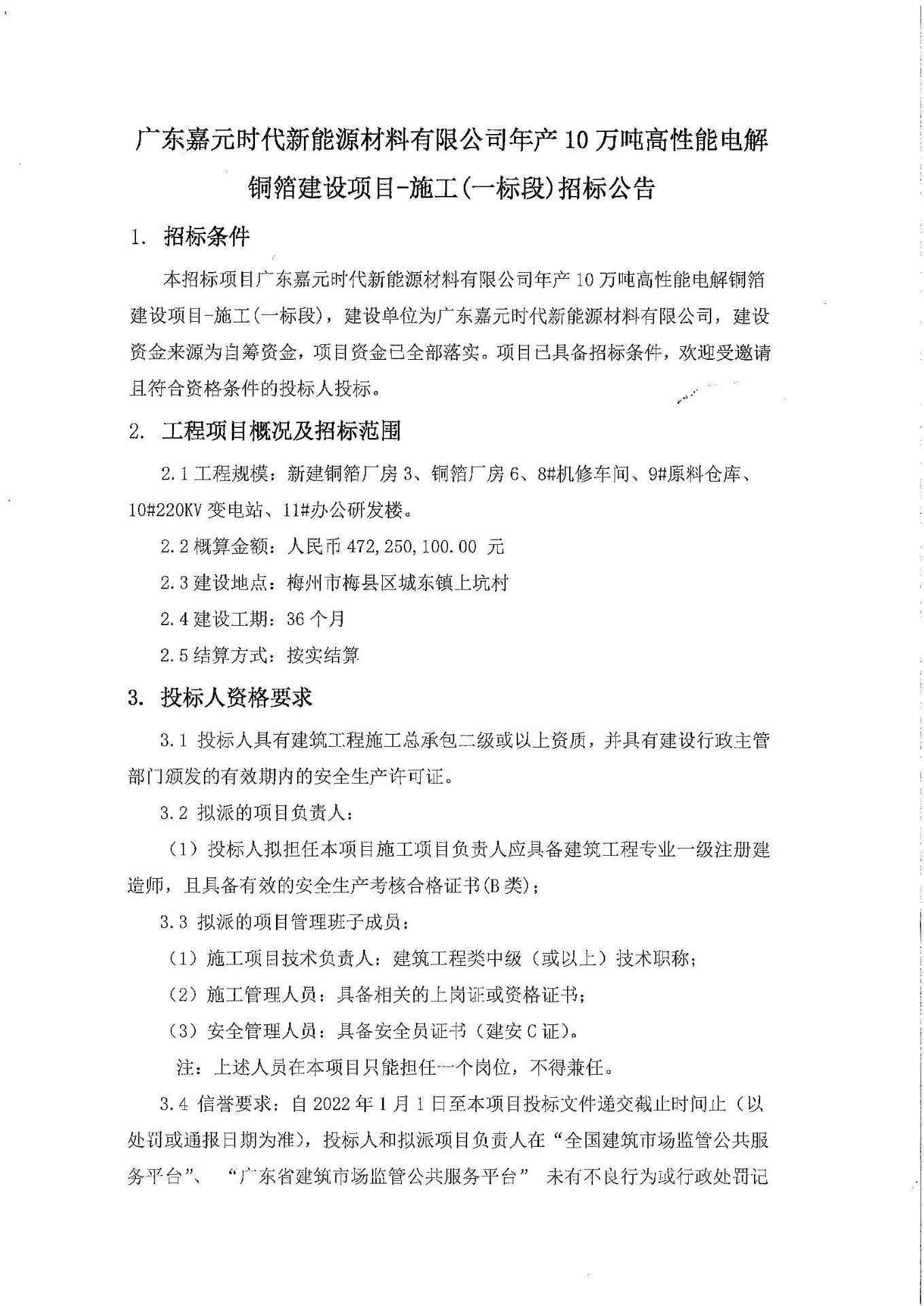 廣東嘉元時(shí)代新能源材料有限公司年產(chǎn)10萬噸高性能電解銅箔建設(shè)項(xiàng)目-施工(一標(biāo)段)招標(biāo)公告