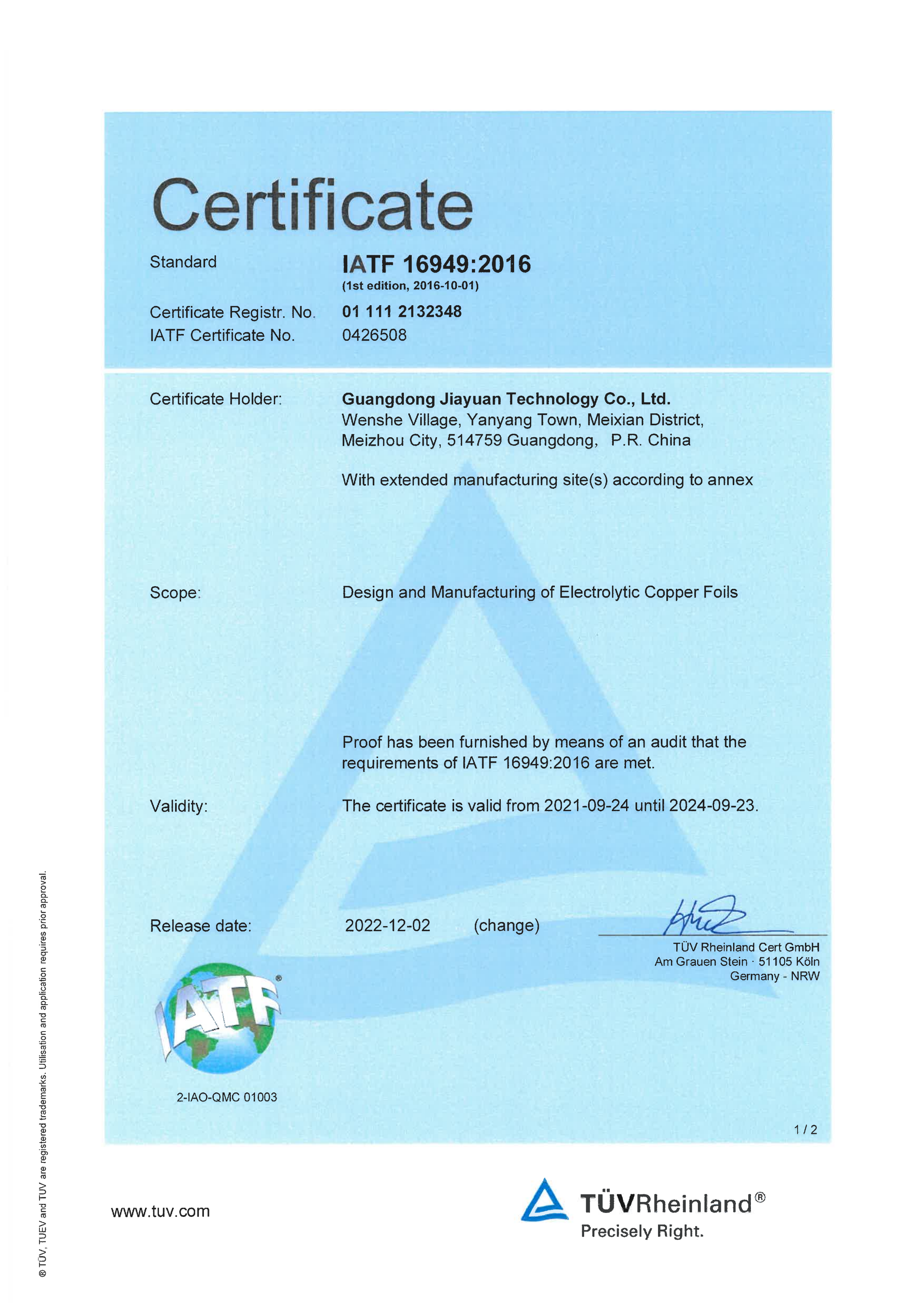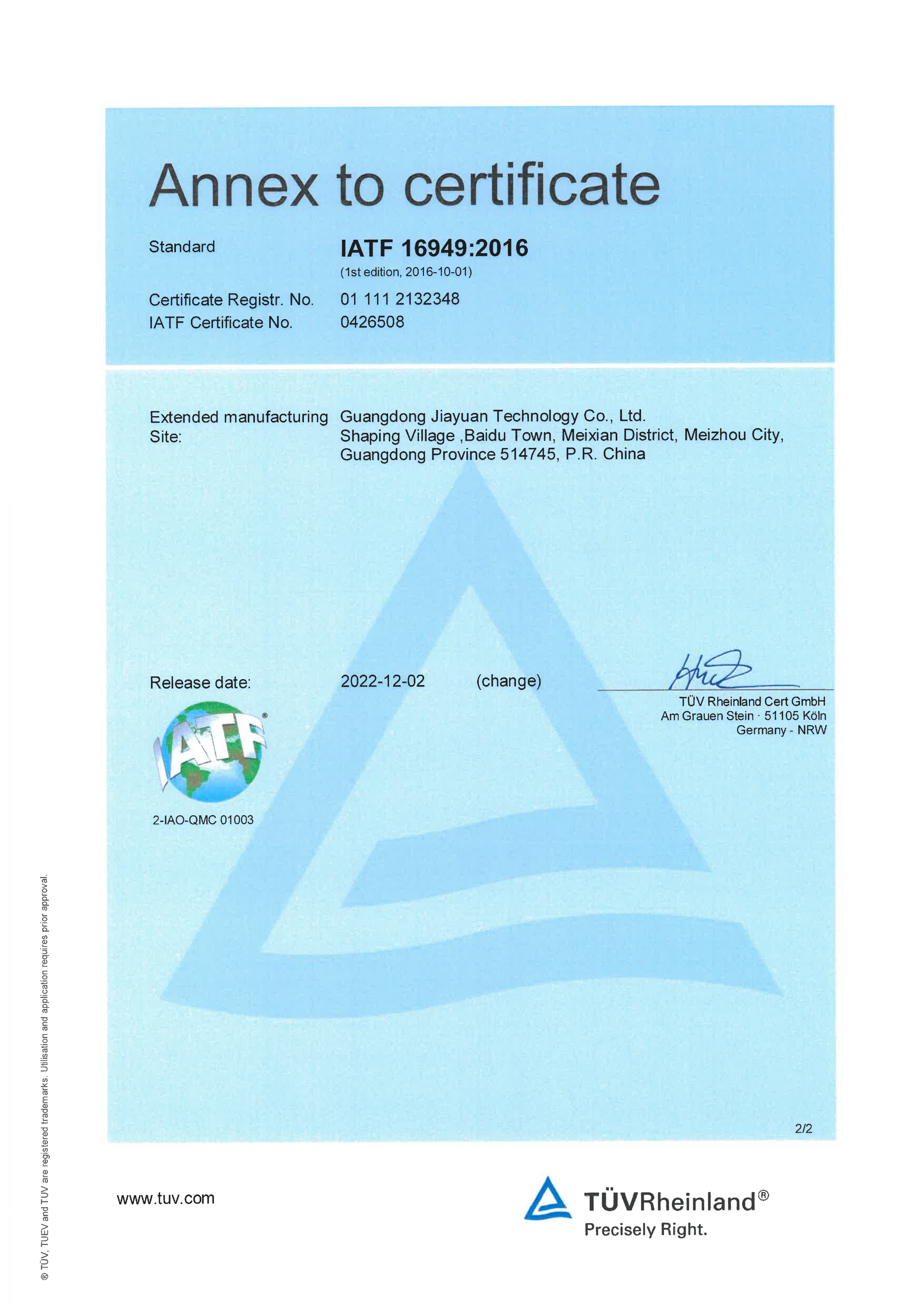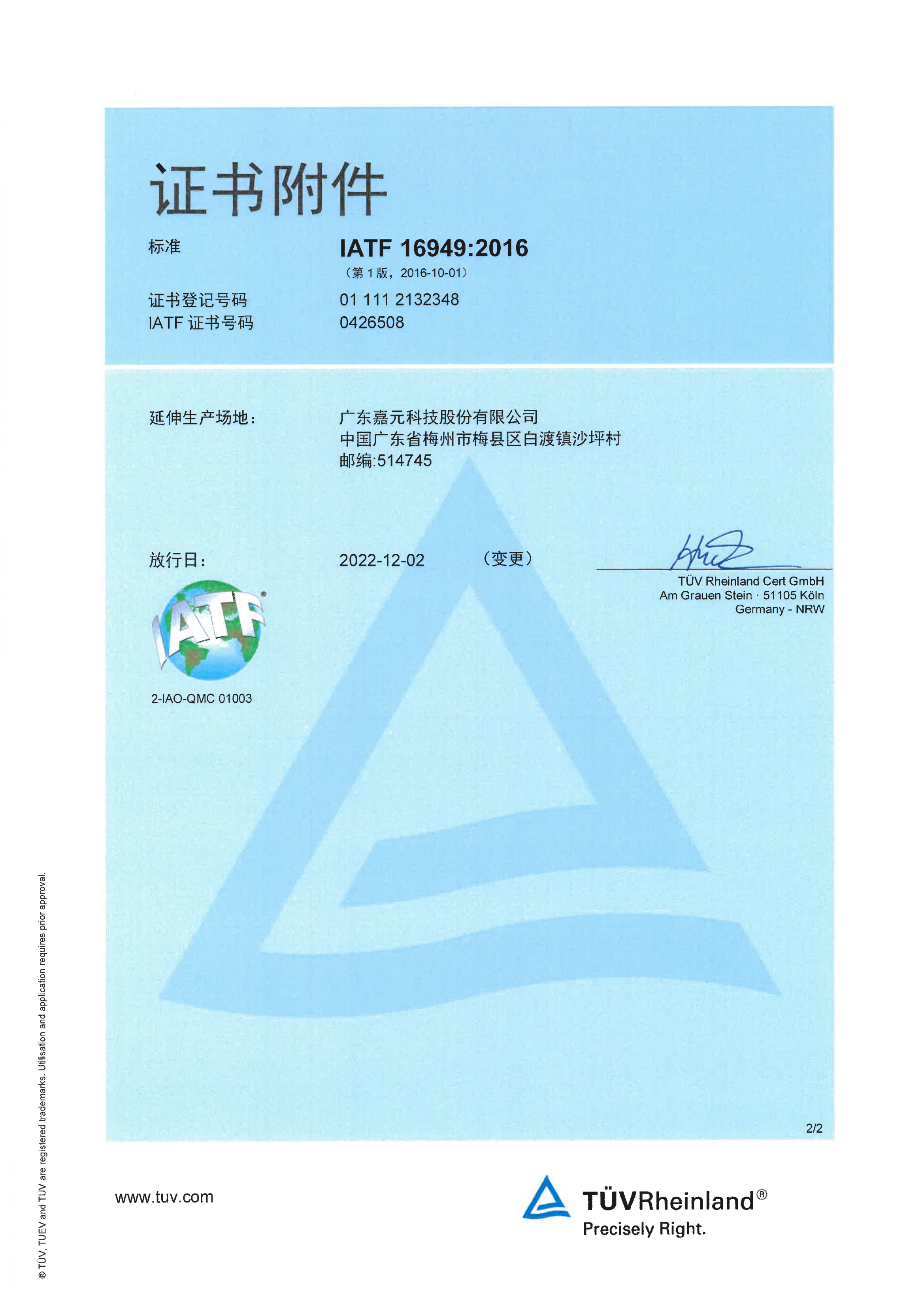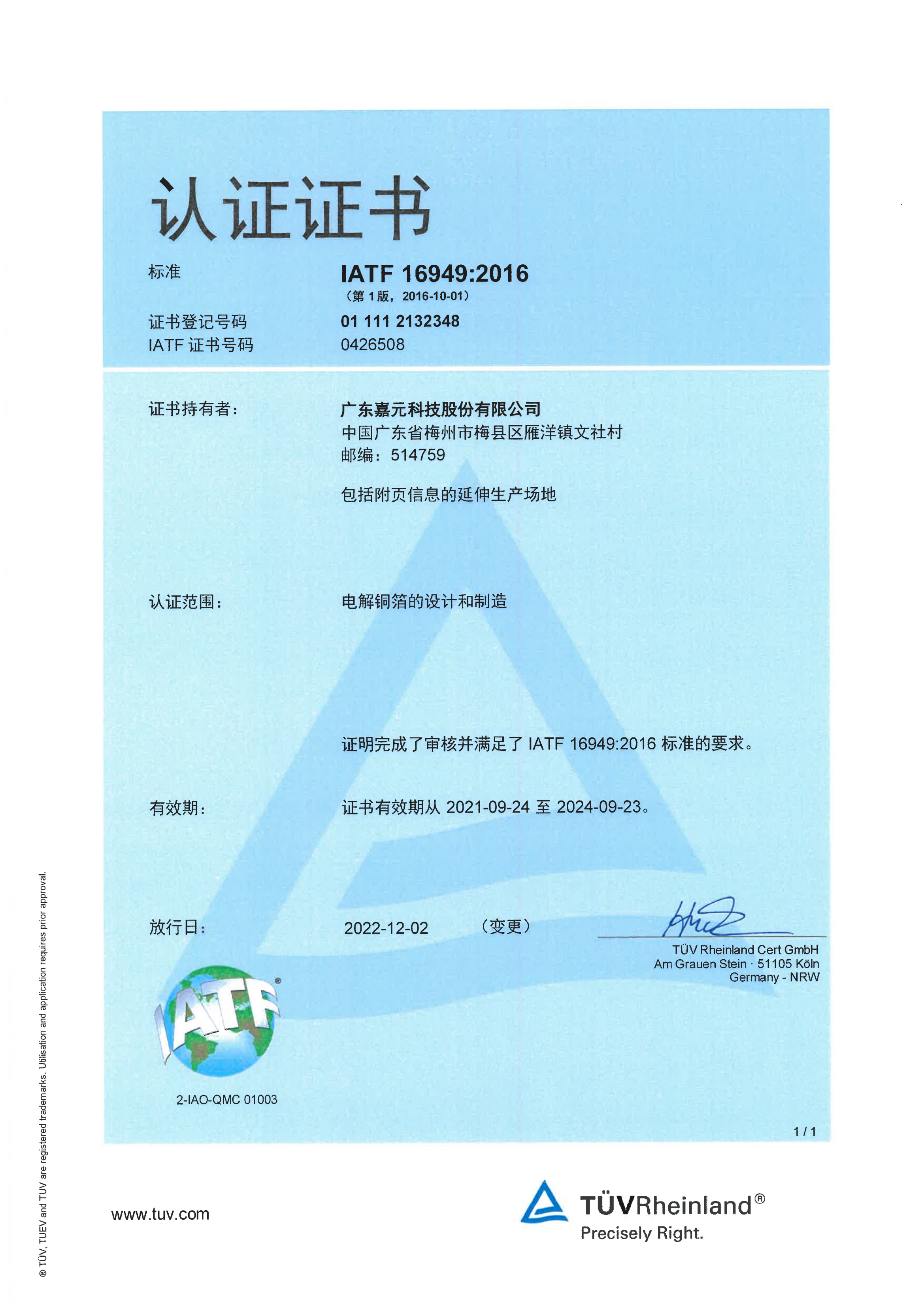 IATF 16949:2016認(rèn)證證書(shū)