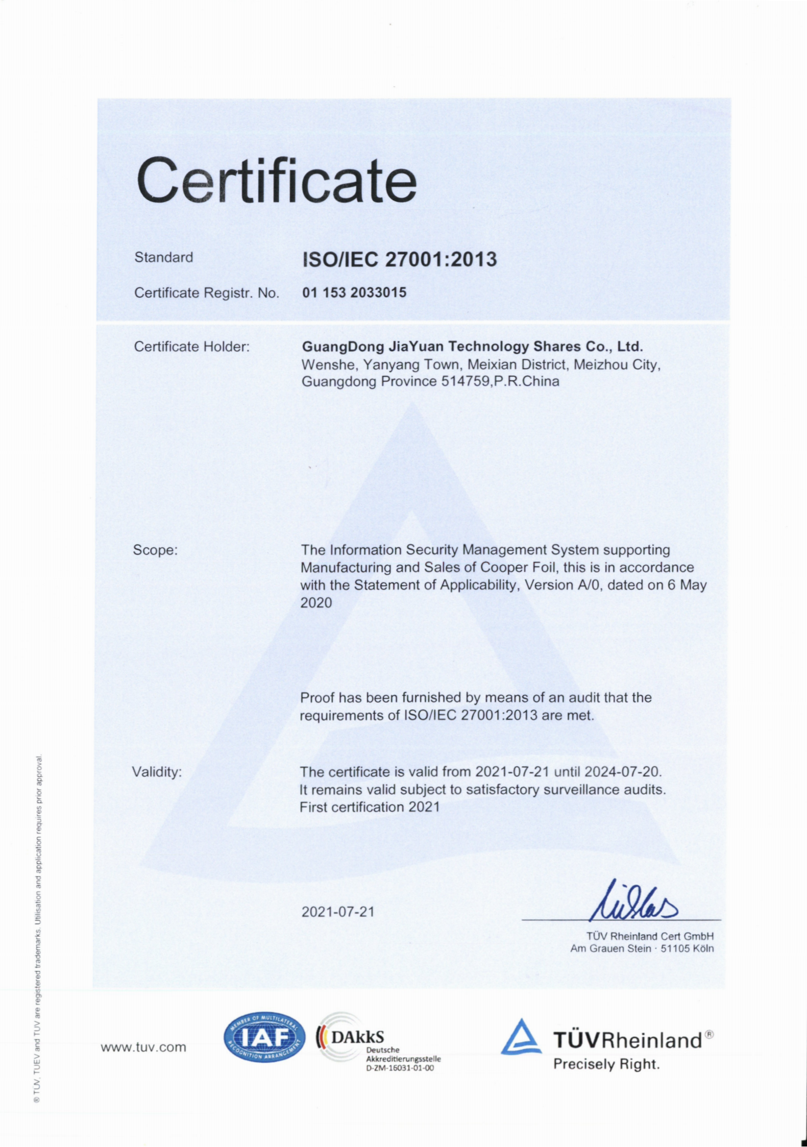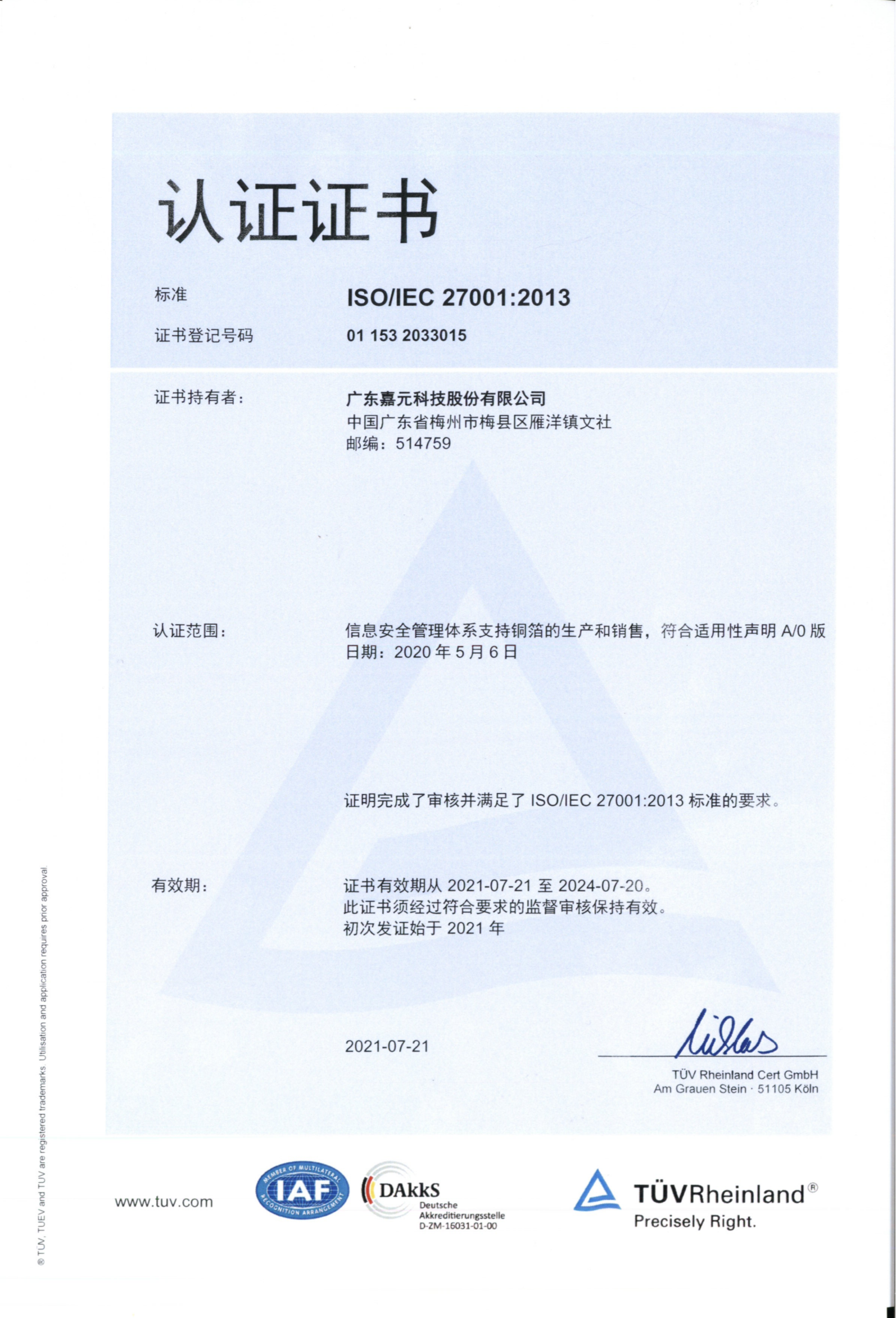 ISO/IEC 27001:2013認證證書