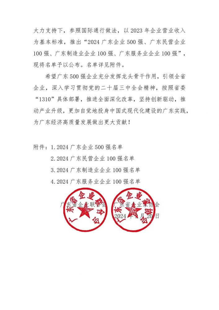 9月20日,廣東省企業(yè)聯(lián)合會、廣東省企業(yè)家協(xié)會在廣州召開以“推進(jìn)全面深化改革,建設(shè)世界一流企業(yè)”為主題的2024廣東500強(qiáng)企業(yè)發(fā)展大會,正式向社會發(fā)布了“2024廣東企業(yè)500強(qiáng)”等多個榜單及其分析報告(以下簡稱“《報告》”)。廣東嘉元科技股份有限公司榮登榜單,位列第360位,連續(xù)兩年獲得該榮譽(yù)。